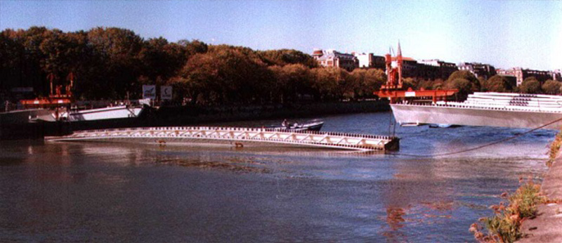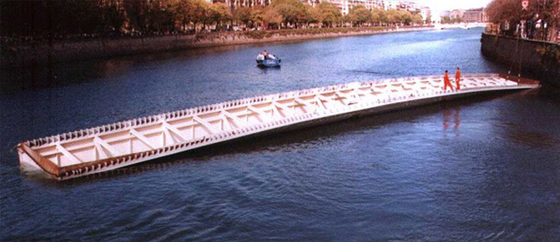 Installation of two 150 t bridge sections across Urumea river, San Sebastian, using mobile cranes, winches and strand jacks for lifting. Dimensions of each section are: Length (60 m), width (7m) and height (3m).