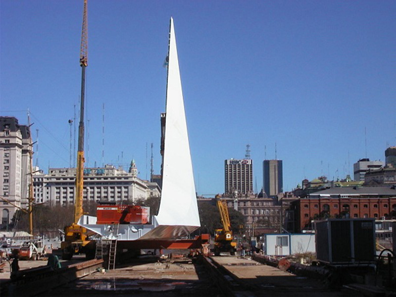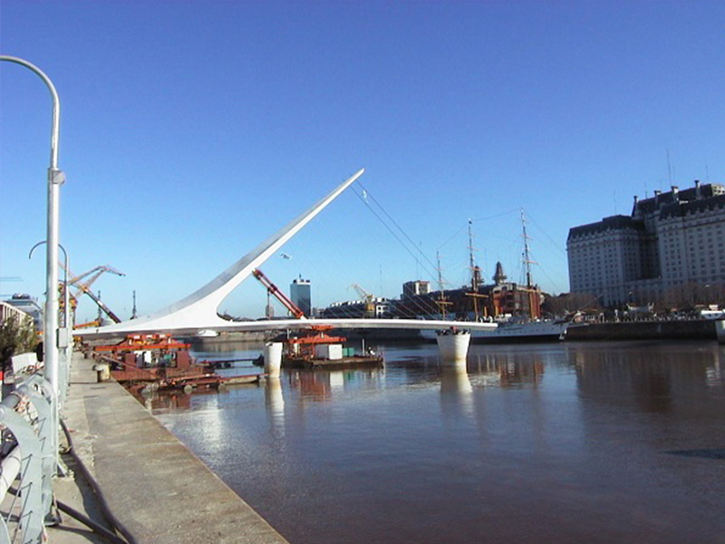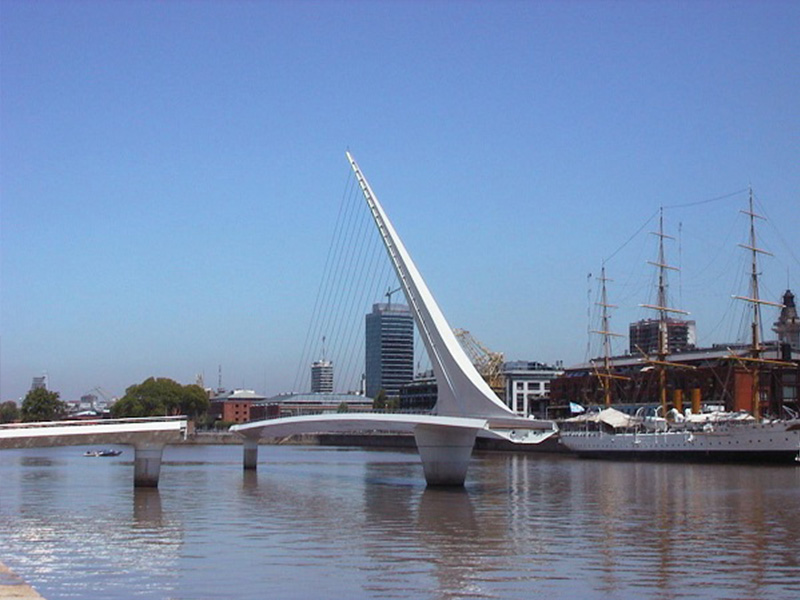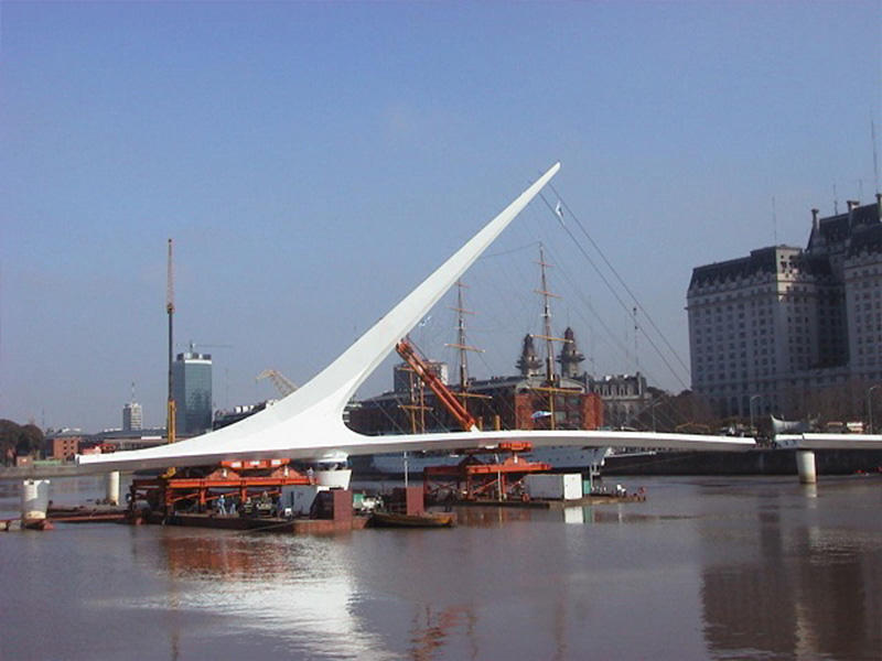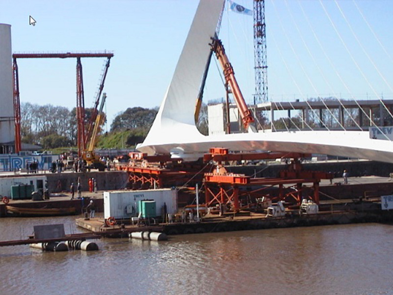 Installation of 1000 steel, pedestrians, rotating bridge on its axle, using 2 barges and six mooring winches. Location, Puerto Madero, Buenos Aires, Argentina.